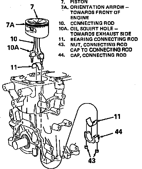 Assemble piston to rod with arrow on piston toward front of engine and oil squirt hole on rod toward exhaust side of engine, Fig. 23. Upon installation, measure connecting rod side clearance using a suitable feeler gauge. Connecting rod side clearance should be 0.0059 to 0.0177 inch.