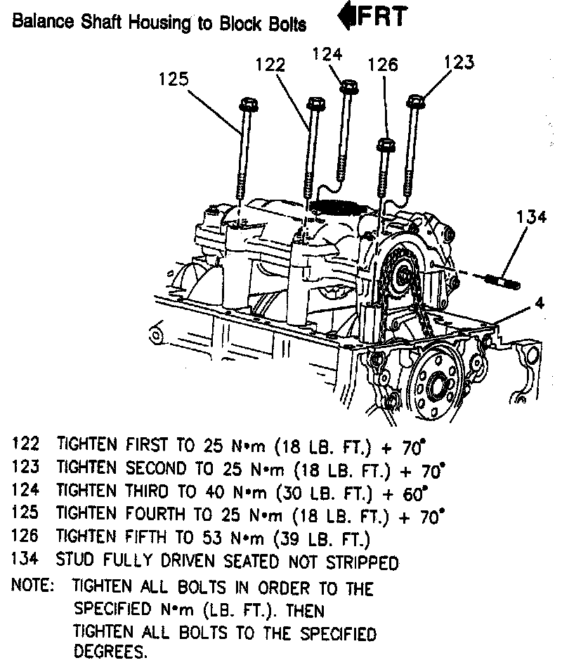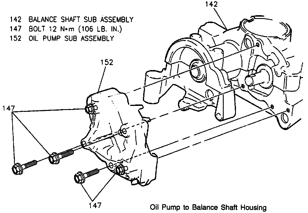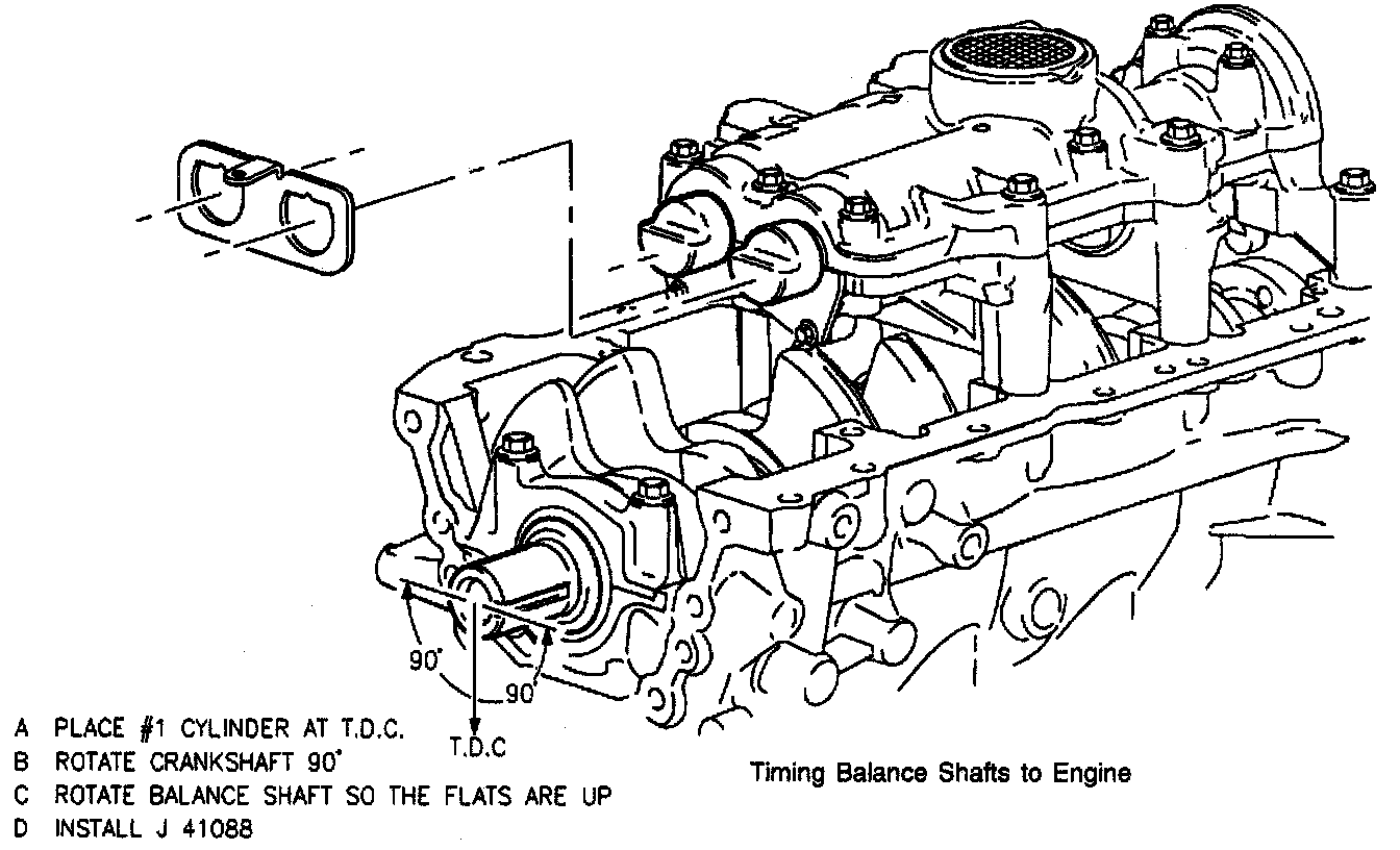 1. Install balance shaft assembly to engine block. Use GM P/N 12345493 on the housing to block bolts.