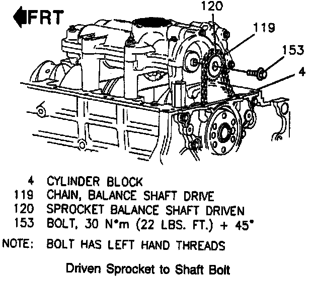 Torque balance shaft driven sprocket bolt (LEFT HAND THREAD) to 30 Nm (22 Lb. Ft.) + 45°. Use J 41088 to hold balance shafts in correct timed location.
