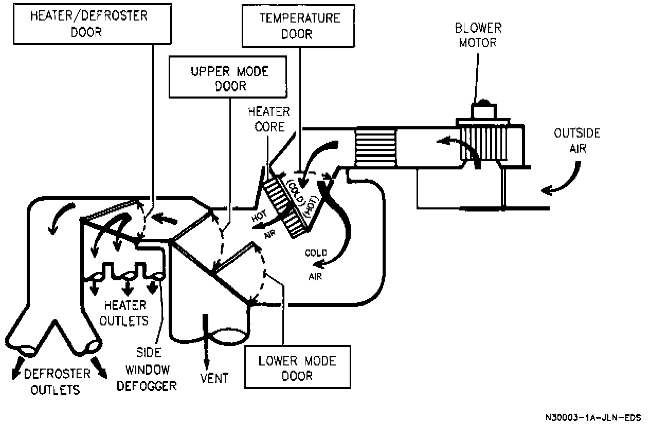 This vehicle has a "flow-through" ventilation system. A supply of outside air flows into the vehicle when the blower motor is running. With the side windows closed, some air will flow into the cowl air inlet grille, through the vehicle and out the pressure relief valves.