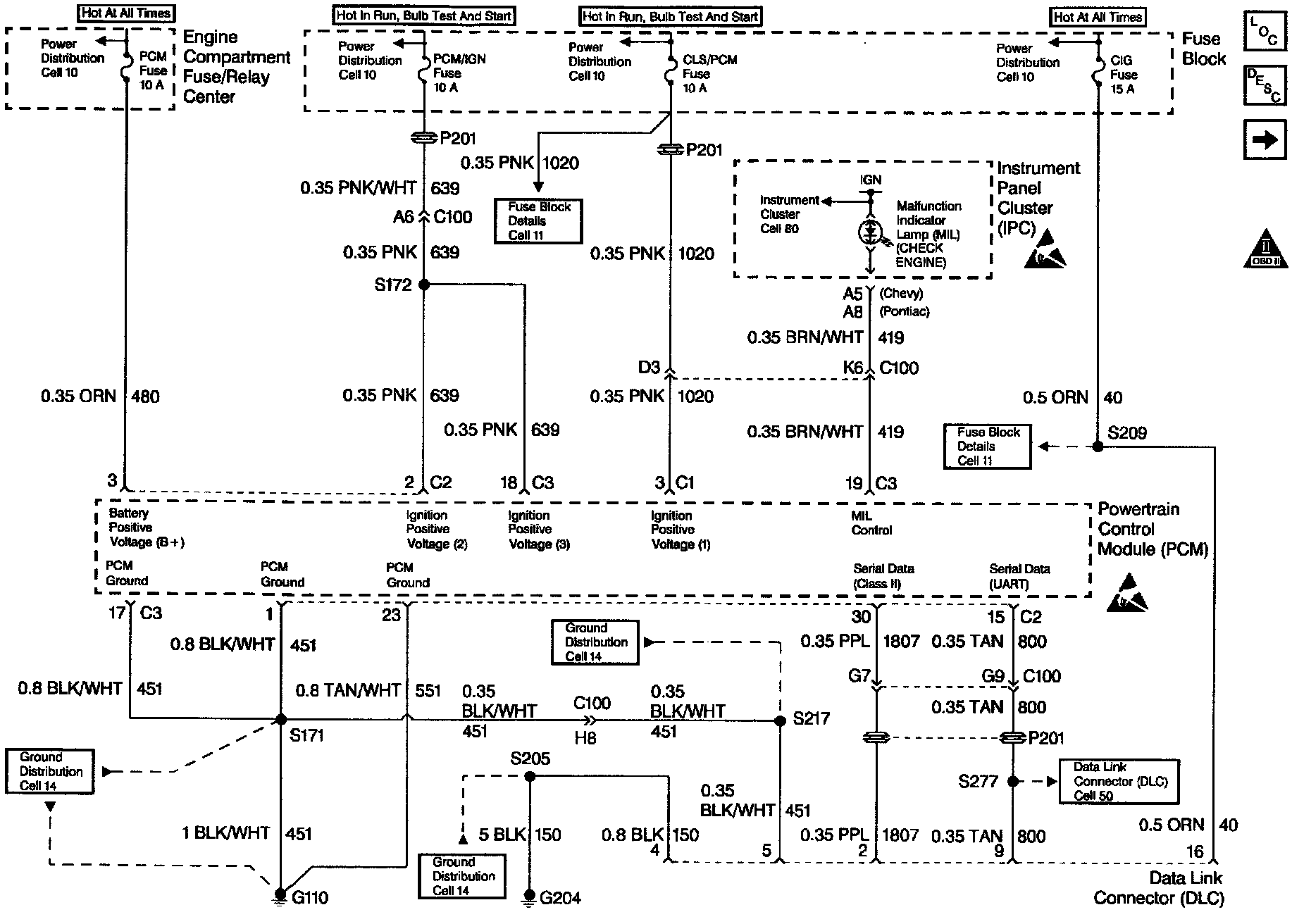 Battery power and ground is supplied for the scan tool through the DLC. The Class 2 serial data circuit to the DLC allows the PCM to communicate with the scan tool. A UART serial data line is used to communicate with other modules such as the Electronic Brake Control Module (EBCM), the Supplemental Inflatable Restraint (SIR) system and the Instrument Panel Cluster (IPC).
