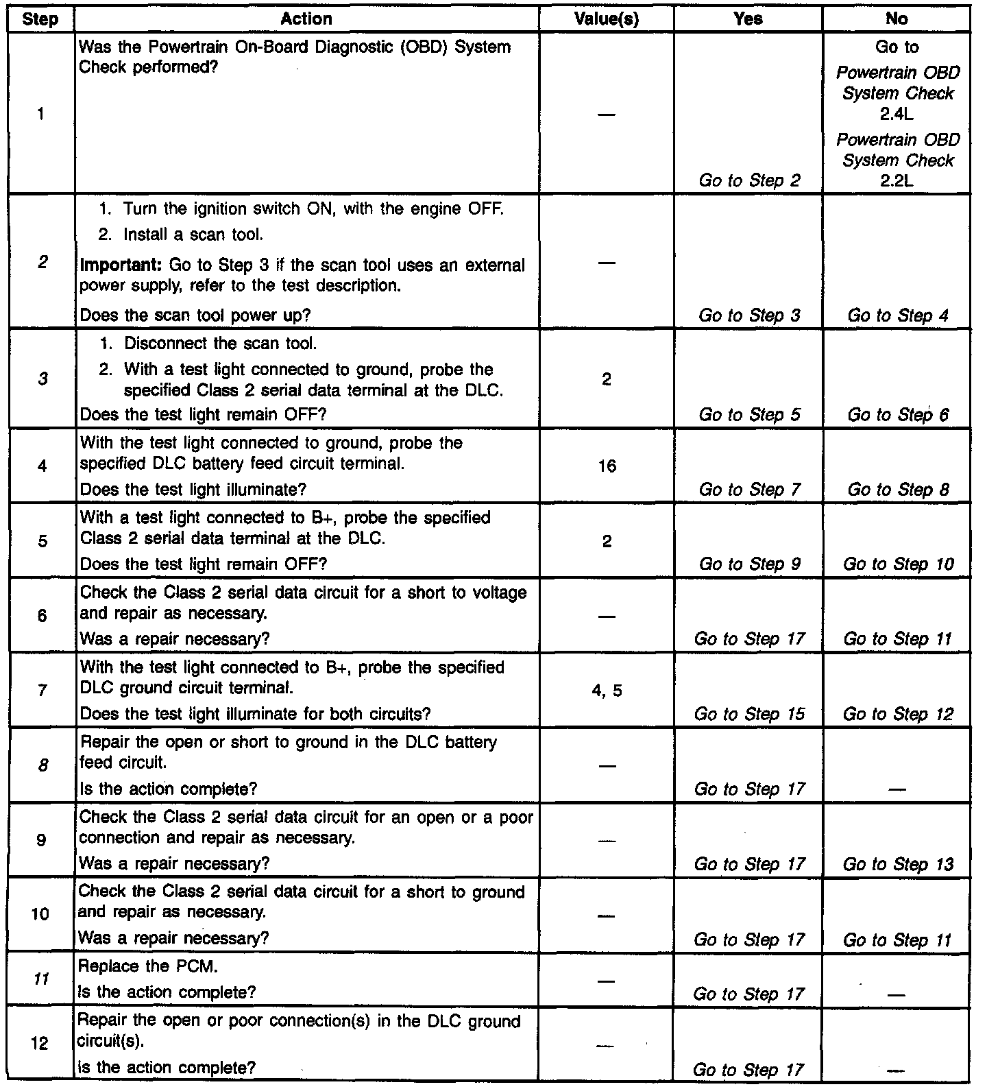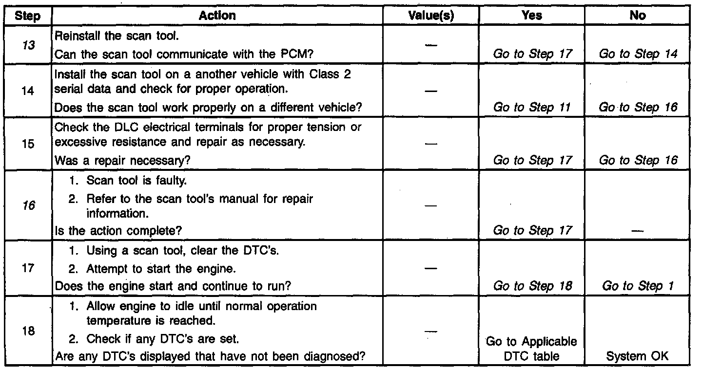 13. Refer to Diagnostic Aids if the scan tool will not display scan data. If the scan tool can communicate with the PCM and you were sent here from the Powertrain OBD System Check table, return to that table and complete the diagnostics there.