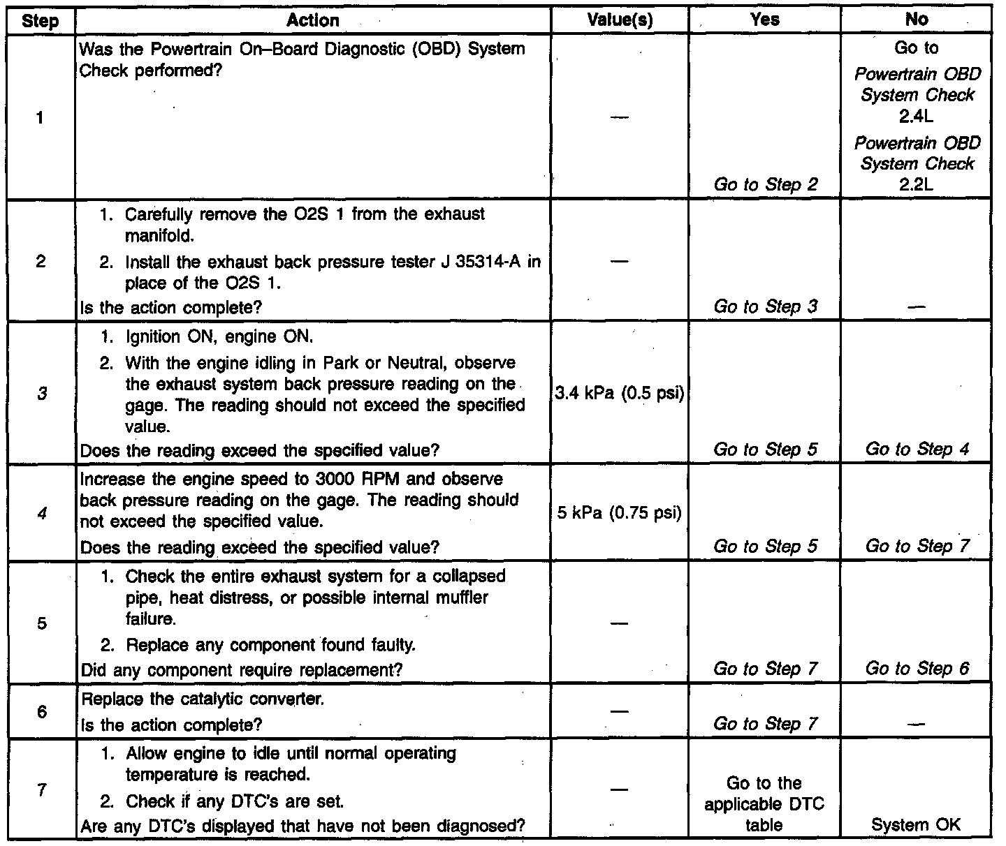 Proper diagnosis for a restricted exhaust system is essential before any components are replaced. Using the Restricted Exhaust System Check table should determine if the exhaust system is restricted. The best place for checking the exhaust system is at the O2S 1 location. Once the test is completed, coat threads with anti-seize compound P/N 5613695 or equivalent prior to O2S re-installation.
