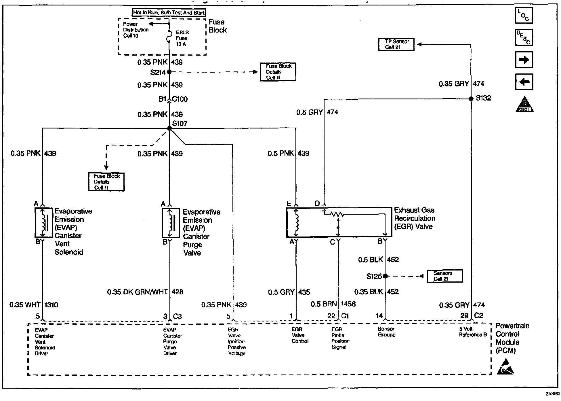 A linear EGR valve is used on this system. The linear EGR valve is designed to accurately supply exhaust gases to the engine without the use of intake manifold vacuum. The valve controls exhaust flow going into the intake manifold from the exhaust manifold through an orifice with a PCM controlled pintle. The PCM controls the pintle position using inputs from the Throttle Position (TP) and Manifold Absolute Pressure (MAP) sensors. The PCM then commands the EGR valve to operate when necessary by controlling a ground signal through the PCM. This can be monitored on a scan tool as the Desired EGR Position. Ignition voltage is supplied to the valve through a fuse.