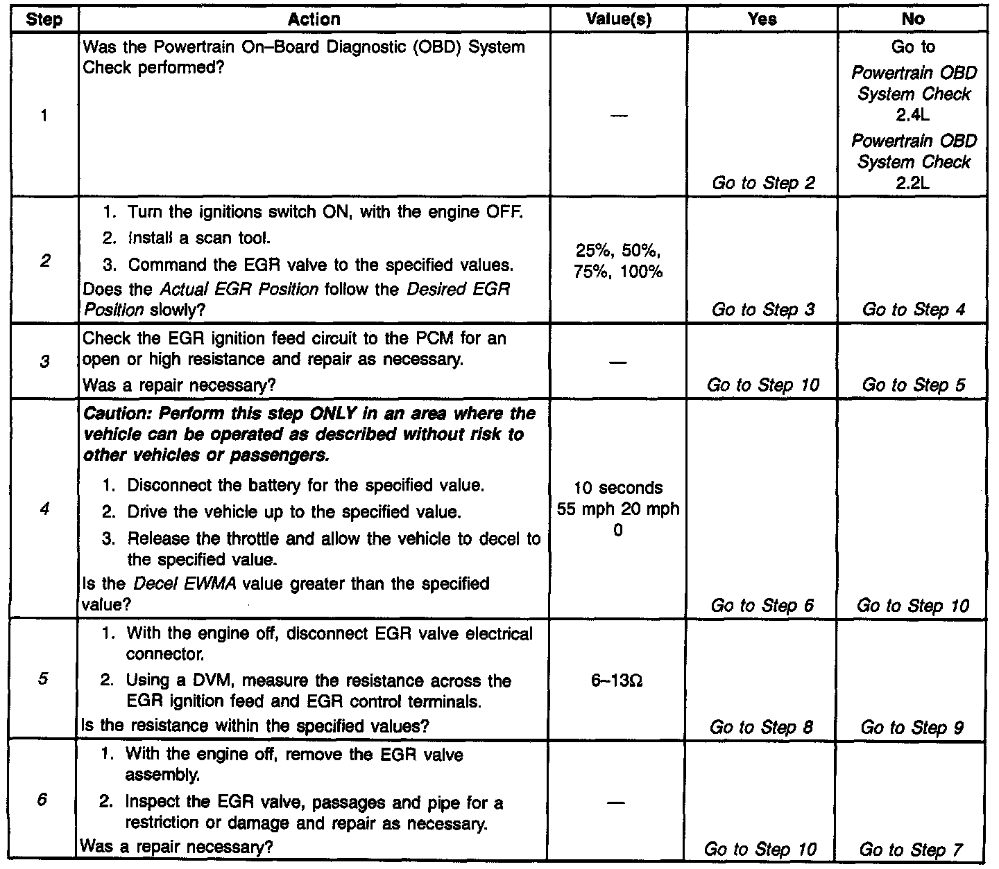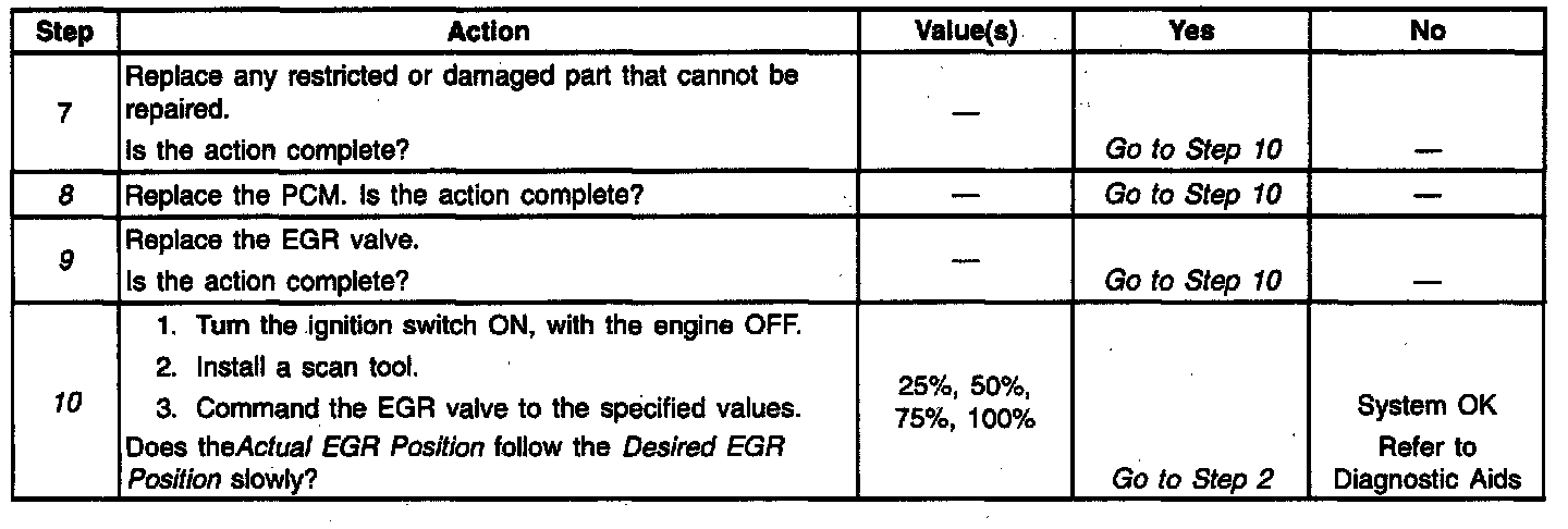 The EGR system is monitored by the PCM in order to detect when a failure occurs that causes emission levels to rise more than one and one-half times normal levels. If the PCM detects that the a system failure has occurred due to a restriction, a DTC P0401 will be set. If the PCM detects that it cannot control the EGR valve as it has commanded, a DTC P1406 is set. Exhaust Gas Recirculation (EGR) System Diagnostic will check normal operation of the EGR system. Refer to the applicable table for diagnosis.