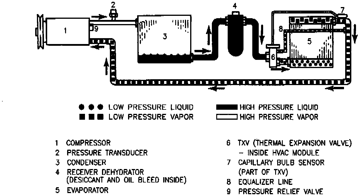 The A/C system uses the V-5 Variable Displacement compressor along with a Thermal Expansion Valve (TXV) as a flow control device.