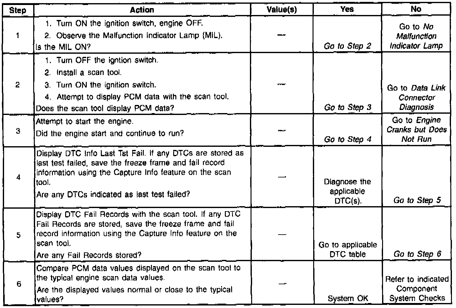 The Powertrain OBD system check is an organized approach to identifying a problem created by an electronic engine control system malfunction. The Powertrain OBD system check must be the starting point for any driveability complaint diagnosis. The Powertrain OBD system check directs the service technician to the next logical Step in diagnosing a complaint. Do not perform this check if no driveability complaint exists. Understanding the table and using it correctly will reduce diagnostic time and prevent the replacement of good parts.