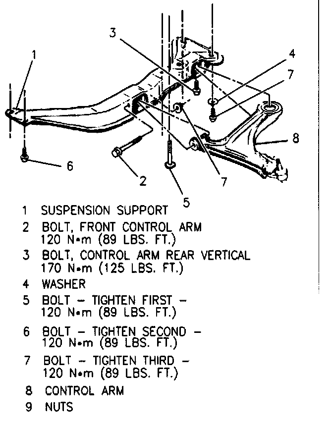 1. Control arm into position and loosely install bolts attaching control arm to suspension support.