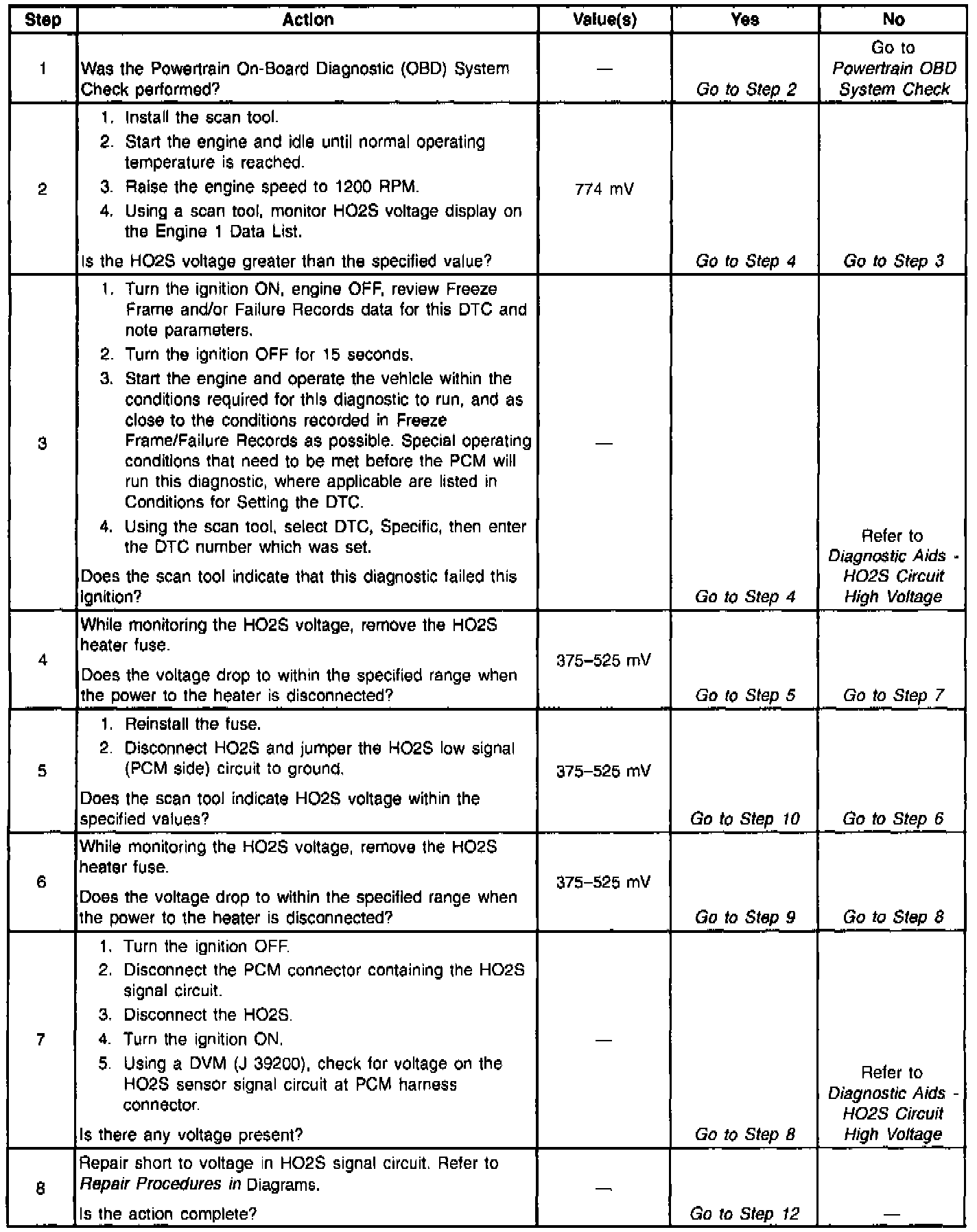 The PCM supplies a voltage of about 450 mV between the Heated Oxygen Sensor (HO2S) high and low signal circuits. The oxygen sensor varies the voltage over a range from about 1000 mV when the exhaust is rich, down through about 10 mV when exhaust is lean.