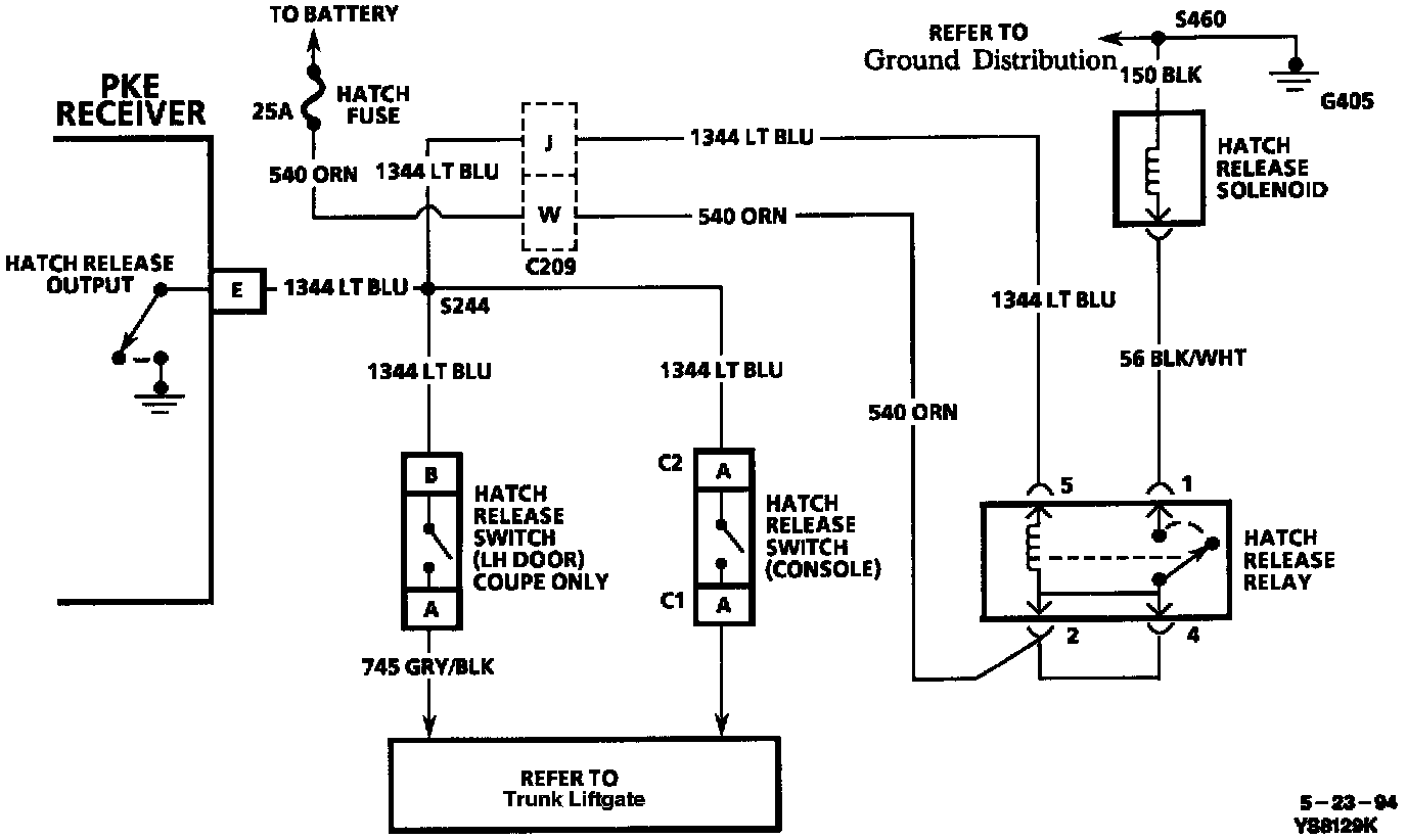 When a valid PKE transmitter sends a hatch release signal. the receiver grounds CKT 1344 at terminal "E" which supplies ground to the hatch release relay coil. This energizes the relay which allows energizing of the hatch release solenoid.