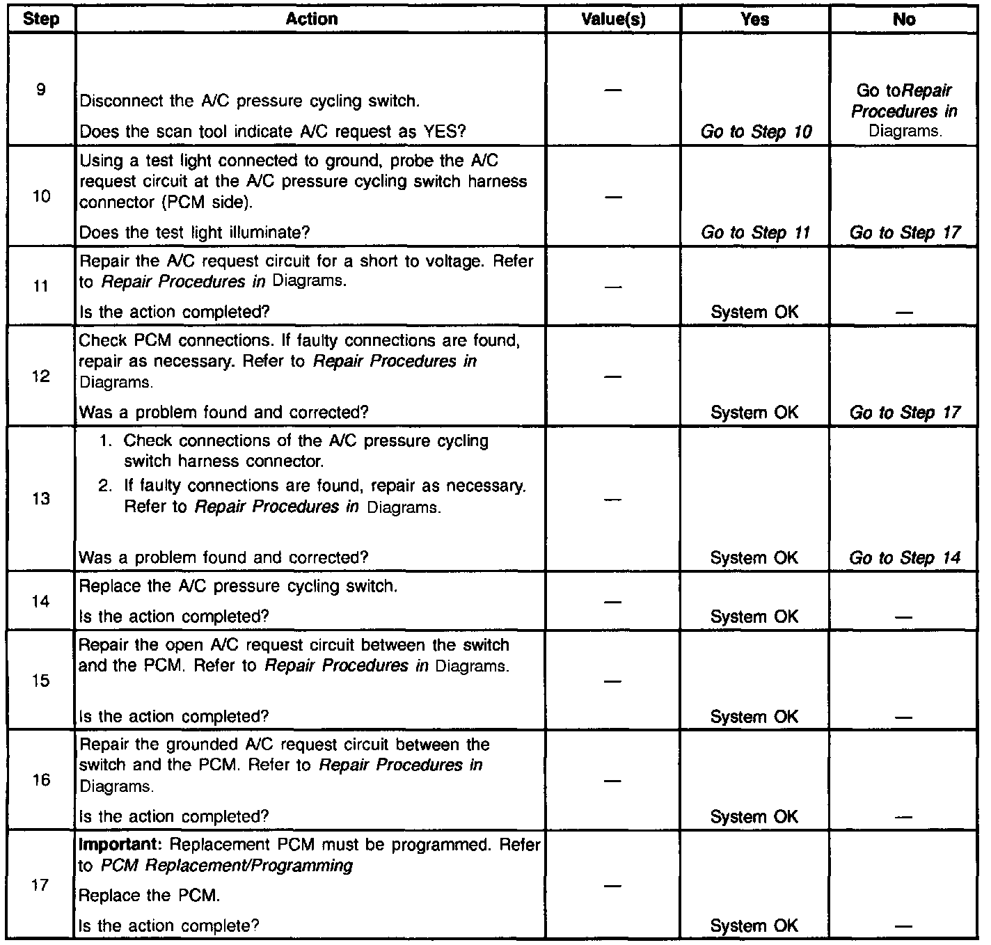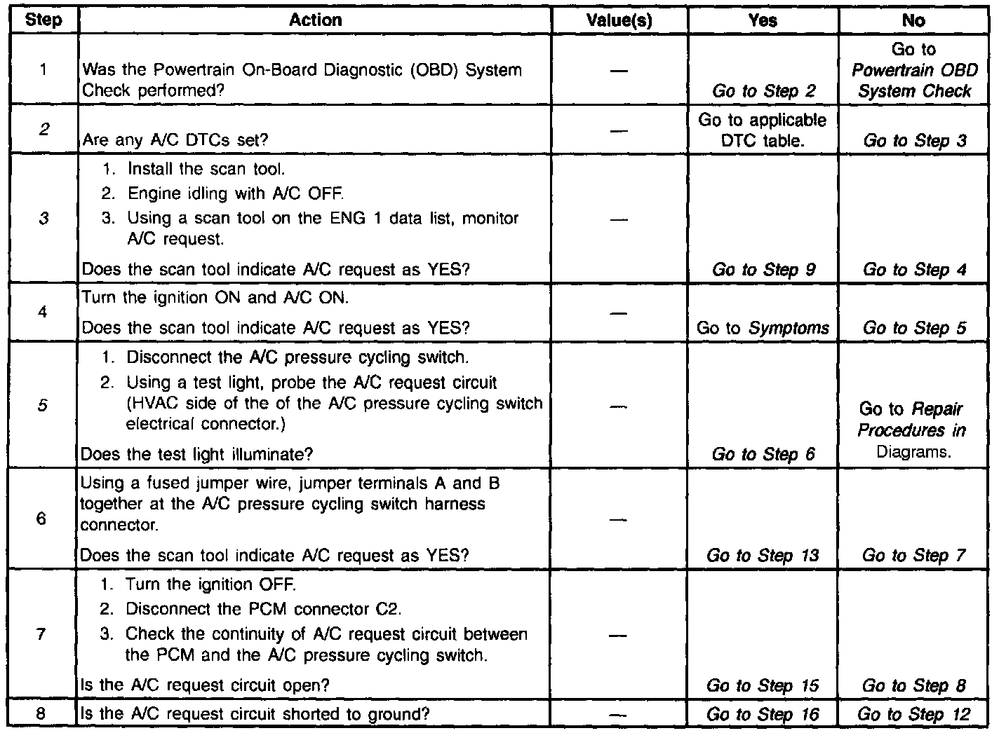 Before using this table, be sure no PCM DTC(s) are stored. The PCM will not activate the A/C clutch with a stored DTC.