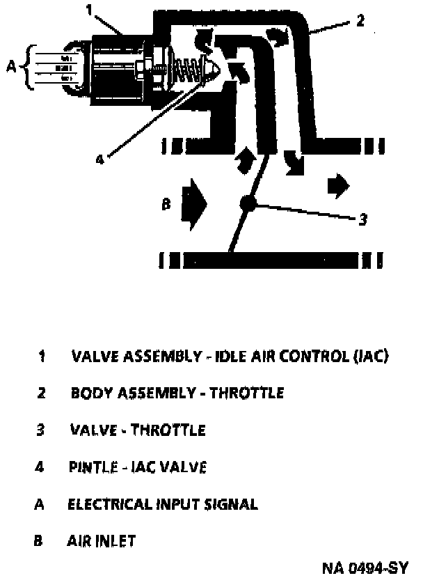 The IAC valve, mounted in the throttle body, controls a portion of the bypass air. An orifice located between the throttle valves also supplies a constant amount of bypass air. By moving a conical valve known as a pintle, IN, towards the seat (to decrease air flow); or OUT, away from the seat (to increase air flow), a controlled amount of air can be bypassed. If engine speed is too low, more air is bypassed to increase RPM. If engine speed is too high, less air is bypassed to decrease RPM.