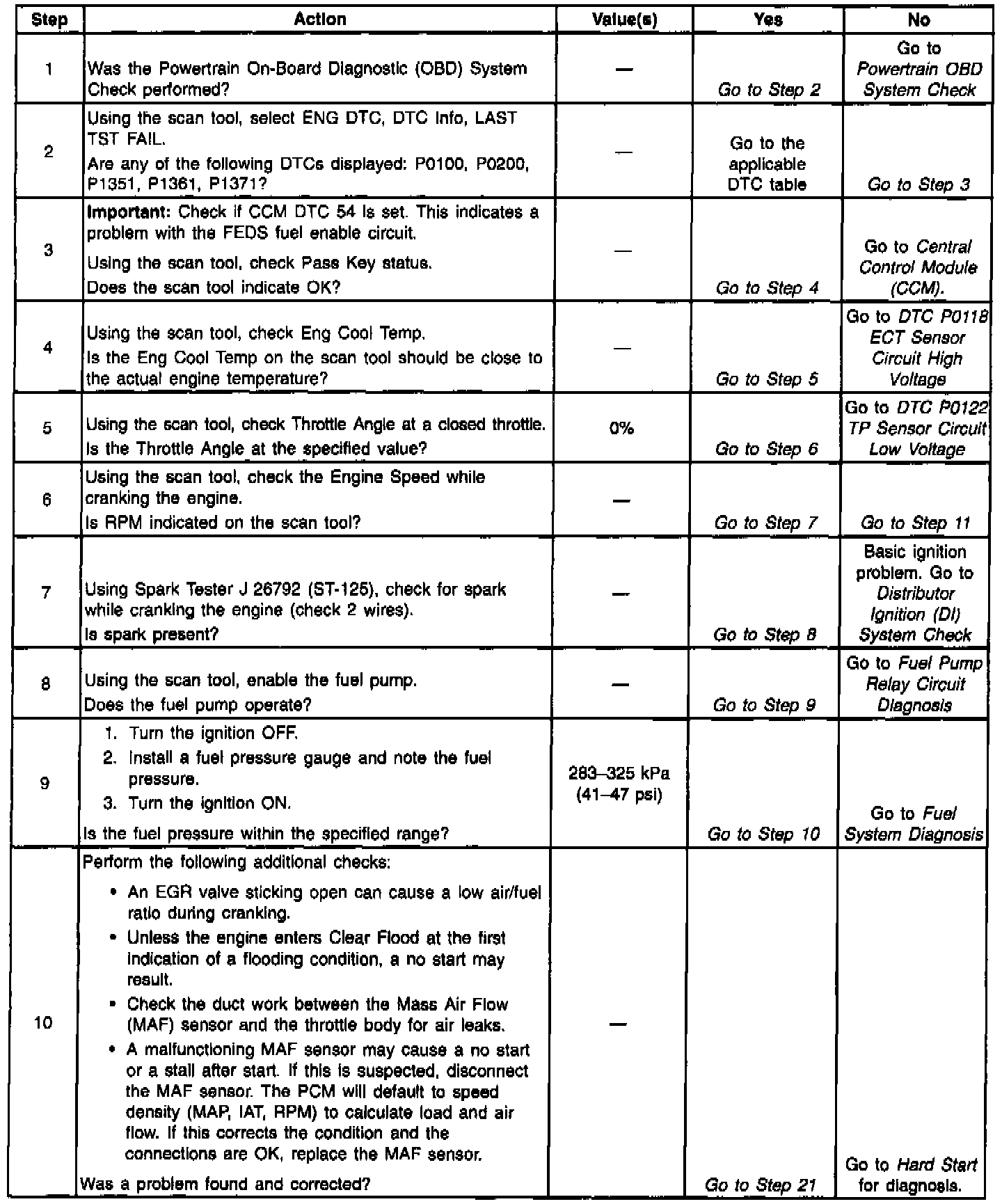 This table assumes that battery condition and engine cranking speed are OK. If not, refer to Starting and Charging for diagnosis. Also, make sure that there is adequate fuel in the tank. Starting and Charging