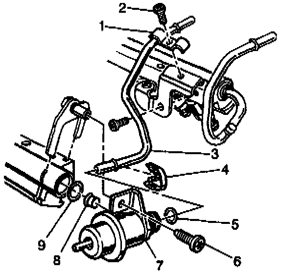 10. Install the inlet/outlet fuel tube retainer and the attaching screw. Tighten the inlet/outlet fuel tube retainer attaching screw to 5 Nm (44 lb in).