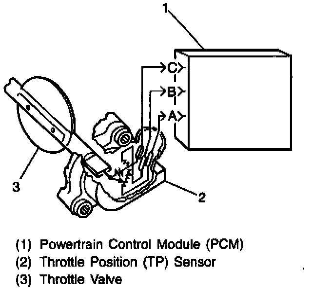 The Throttle Position (TP) sensor is a potentiometer and is connected to the throttle shaft on the throttle body. By monitoring the voltage on the signal line, the PCM calculates throttle position. As the throttle valve angle is changed (accelerator pedal moved), the TP sensor signal also changes. At a closed throttle position, the output of the TP sensor is low. As the throttle valve opens, the output increases so that at Wide Open Throttle (WOT), the output voltage should be above 4.0 volts.