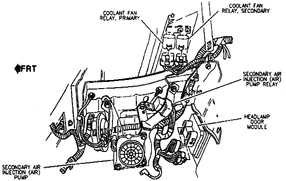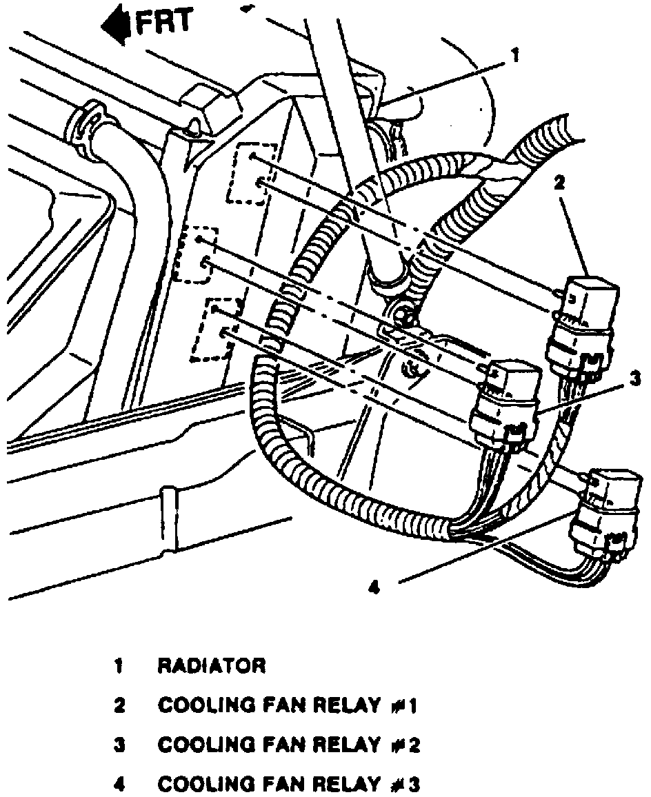 The cooling fan relays are located on the upper radiator support, forward of the left front wheelhouse,