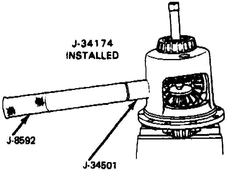 3. Assemble adapter plate from tool No. J-34174 or equivalent, into bottom side gear, then install threaded adapter plate into top side gear. Thread forcing screw into threaded adapter, and tighten until snug. This will force dished spacers to collapse and allow a loose condition in the case, Fig. 8.