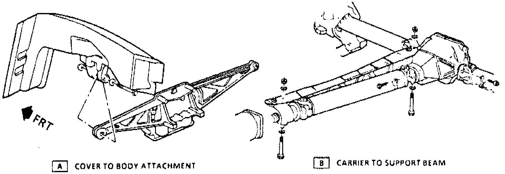 10. Reverse procedure to install. When installing driveline support, apply sealer at locations as shown in, Fig. 2. Check rear suspension alignment.