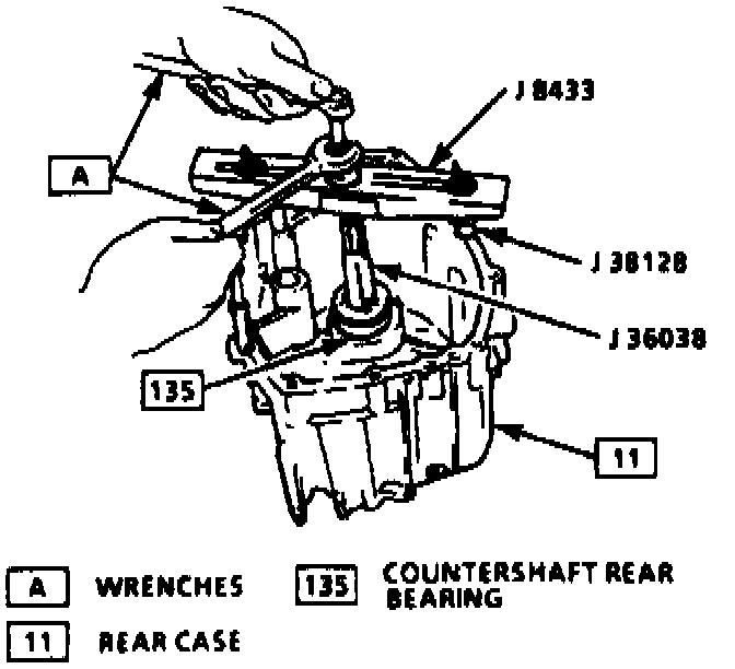14. Remove output shaft output bearing from rear case, then countershaft rear bearing from rear case using tool Nos. J 8433, J 38128 and J 36038 or equivalents.