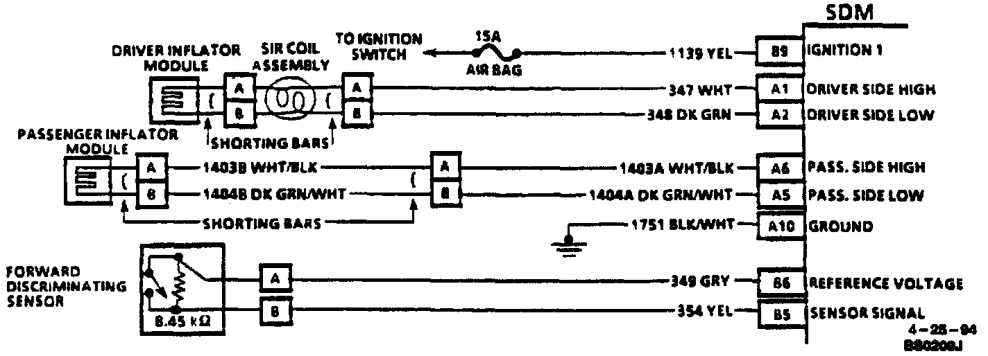 When the ignition switch is turned "ON," the SDM will perform tests to diagnose critical malfunctions within itself. Upon passing these tests Ignition 1," 36 VLR, and deployment loop voltages are measured to ensure they are within their respective normal voltage ranges. The SDM then proceeds with the "Current Source Diagnostics." "Passenger Side Low" terminal "A5" is grounded through a resistor and the passenger current source connected to "Passenger Side High" terminal "A6" allows a known amount of current to flow. After "Current Source Diagnostics" are completed the SDM removes the low resistance ground from "Passenger Side Low" and switches the passenger current source at "Passenger Side High." The SDM then measures the voltage at "Passenger Side High" and "Passenger Side Low" during "Continuous Monitoring." By monitoring the voltage difference between "Passenger Side High" and "Passenger Side Low" the SDM calculates the combined resistance of the passenger inflator module, harness wiring CKTs 1403 and 1404, and connector terminal contact.