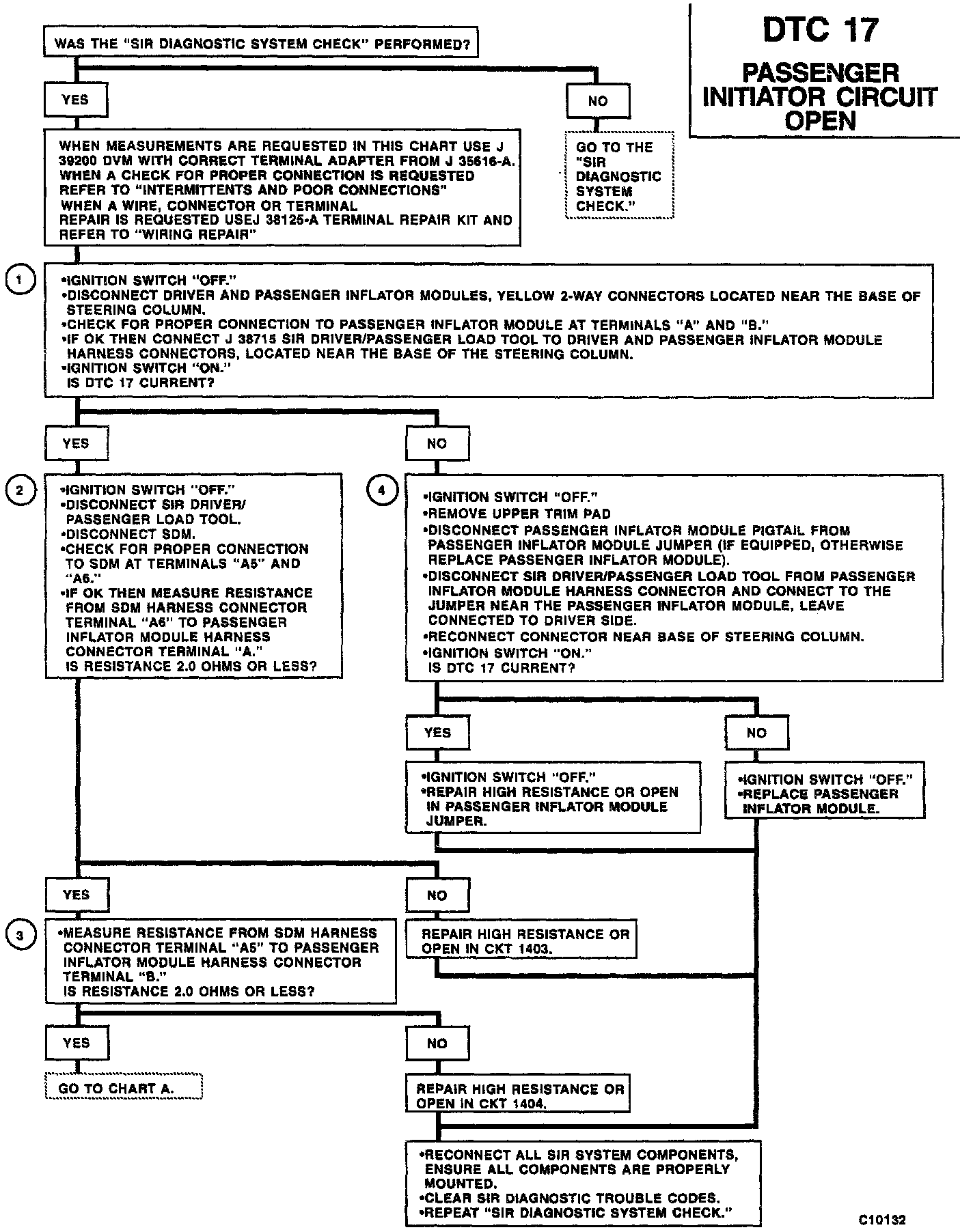 An intermittent condition is likely to be caused by a poor connection at the passenger inflator module harness connector terminals "A" and "B," SDM terminals "A5" and "A6," or an open in CKT 1403 or CKT 1404.