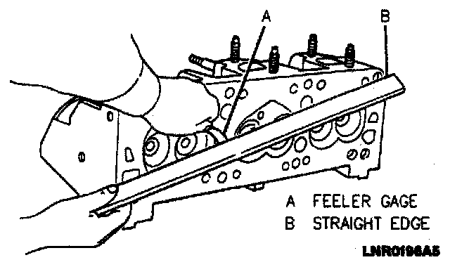 4. Cylinder head deck, intake and exhaust manifold mating surfaces for flatness. These surfaces may be reconditioned by milling. If the surfaces are "out of flat" by more than 0.127 mm (0.005 in.), the surface should be milled. If more than 0.25 mm (0.010 in.) of metal must be removed from the head, it should be replaced.