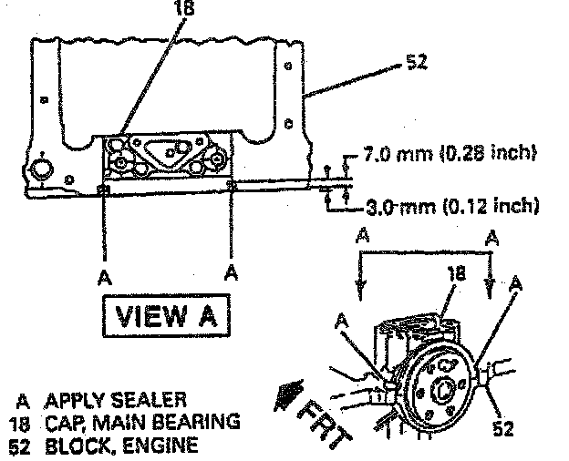 Apply a small amount of sealer, GM P/N 1234579 or equivalent, on either side of the rear main bearing cap, where the seal surface on the cap meets the cylinder block.