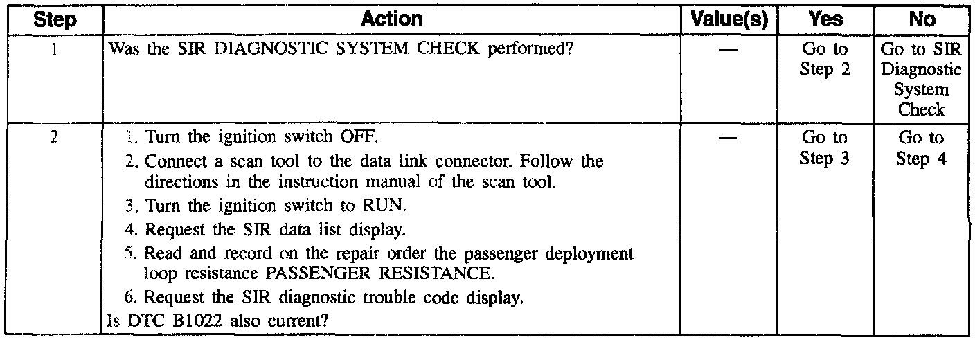 The diagnostic table directs the technician to note the entry value of PASSENGER RESISTANCE. Comparing the value of PASSENGER RESISTANCE over multiple ignition cycles can be helpful in determining if an intermittent condition exists.