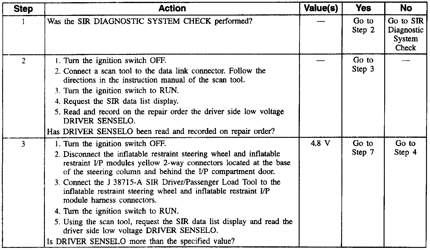 2. This test determines the driver side low voltage measured by the inflatable restraint sensing and diagnostic module.