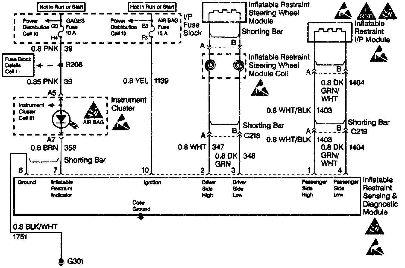 When you first turn the ignition switch to the RUN position, the inflatable restraint sensing and diagnostic module performs tests to diagnose critical malfunctions within itself. Upon passing these tests IGNITION 1, 23 VLR and deployment loop voltages are measured to make sure they are within their respective normal voltage ranges. The inflatable restraint sensing and diagnostic module monitors the voltages at DRIVER SIDE LOW terminal 3 and PASSENGER SIDE LOW terminal 4 to detect shorts to B+ in the inflator module circuits.