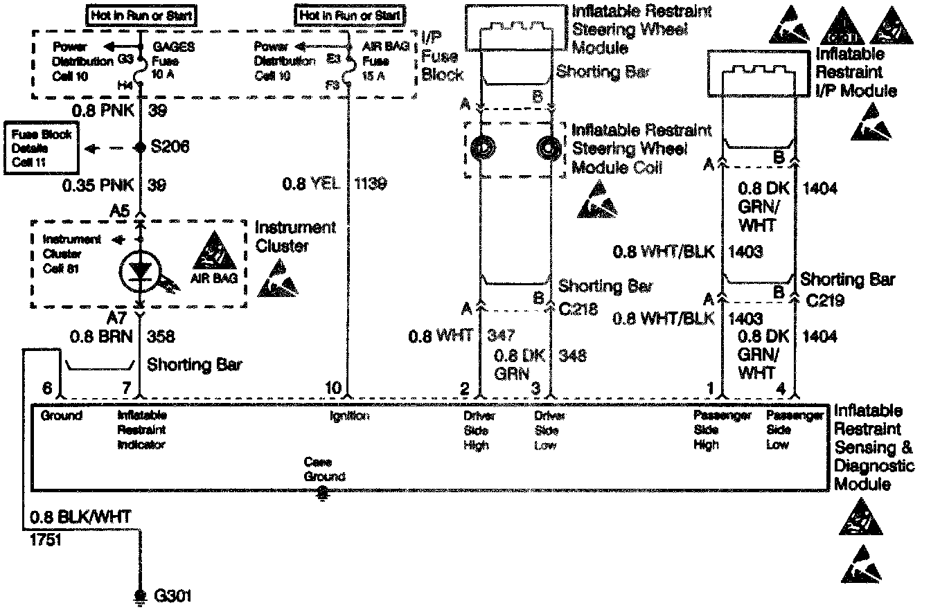 The inflatable restraint sensing and diagnostic module contains a sensing device that converts vehicle velocity changes to an electrical signal. The inflatable restraint sensing and diagnostic module processes the generated electrical signal and compares it to a value stored in memory. When the generated signal exceeds the stored value, the inflatable restraint sensing and diagnostic module performs additional signal processing and compares the generated signals to signals stored in memory. When two of the generated signals exceed the stored values, the inflatable restraint sensing and diagnostic module will cause current to flow through the inflator modules, deploying the air bags. DTC B1053 will set instead of a DTC B1051 when a deployment occurs while an inflator circuit fault is present that could possibly result in a non-deployment situation in one or both inflator modules.