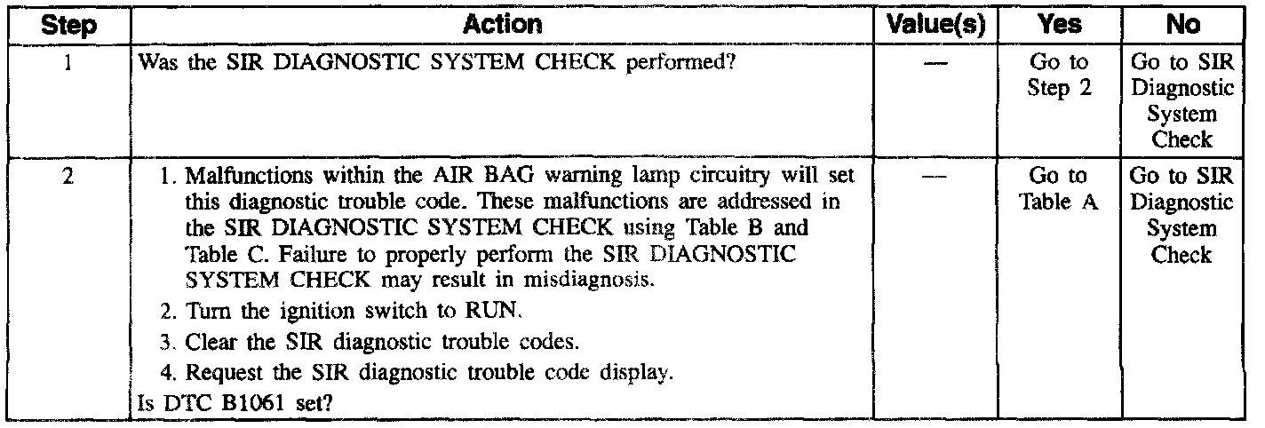 Refer to TABLES B Table B Air Bag Warning Lamp Comes On Steady