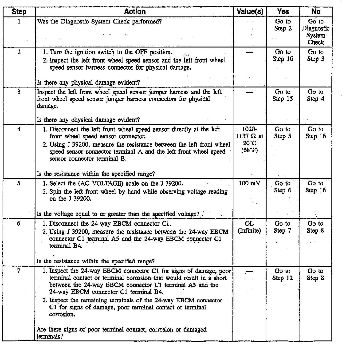 Wheel speed sensor intermittent malfunctions may be difficult to locate. Care should be taken not to disturb any electrical connections prior to an indicated step of the diagnosis table. This will ensure that an intermittent connection will not be corrected before the source of the malfunction is found.