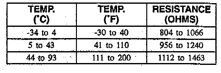 This table contains resistance values for the front wheel speed sensors at varying temperatures for use in diagnosis. The values are approximate and should be used as a guideline for diagnosis.