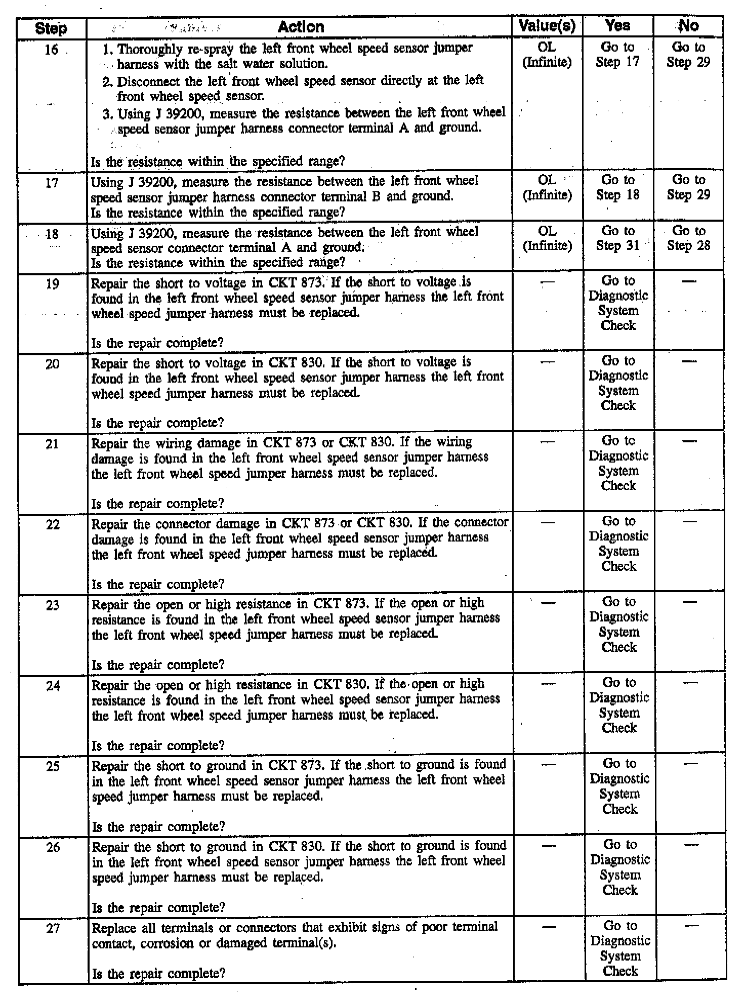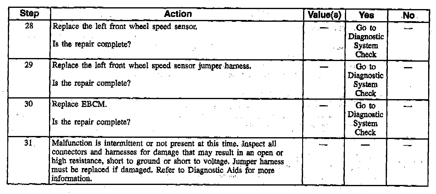 Wheel speed sensor intermittent malfunctions may be difficult to locate. Care should be taken not to disturb any electrical connections prior to an indicated step of the diagnosis table. This will ensure that an intermittent connection will not be corrected before the source of the malfunction is found.