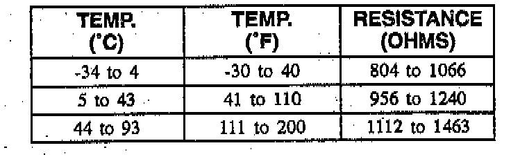 This table contains resistance values for the front wheel speed sensors at varying temperatures for use in diagnosis. The values are approximate and should be used as a guideline for diagnosis.