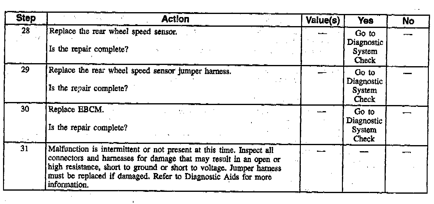 Wheel speed sensor intermittent malfunctions may be difficult to locate. Care should be taken not to disturb any electrical connections prior to an indicated step of the diagnosis table. This will ensure that an intermittent connection will not be corrected before the source of the malfunction is found.