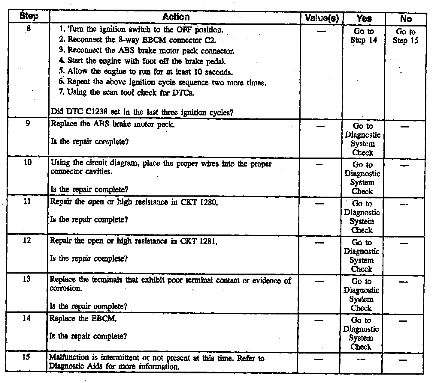 DTC C1238 can be set during brake motor initialization at O km/h (0 mph) with the brake off. DTC C1238 can also be set during brake motor initialization at 5 km/h (3 mph) with the brake on. If the EBCM detects that the ESB could not hold the piston in the home position, a malfunction exists. DTC C1286 is always set with DTC C1238.