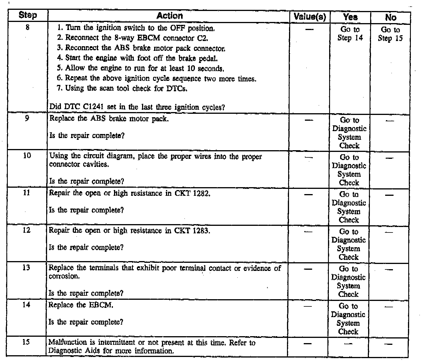 DTC C1241 can be set during brake motor initialization at O km/h (O mph) with the brake off. DTC C1241 can also be set during brake motor initialization at 5 km/h (3 mph) with the brake on. If the EBCM detects that the ESB could not hold the piston in the home position, a malfunction exists. DTC C1286 is always set with DTC C1241.