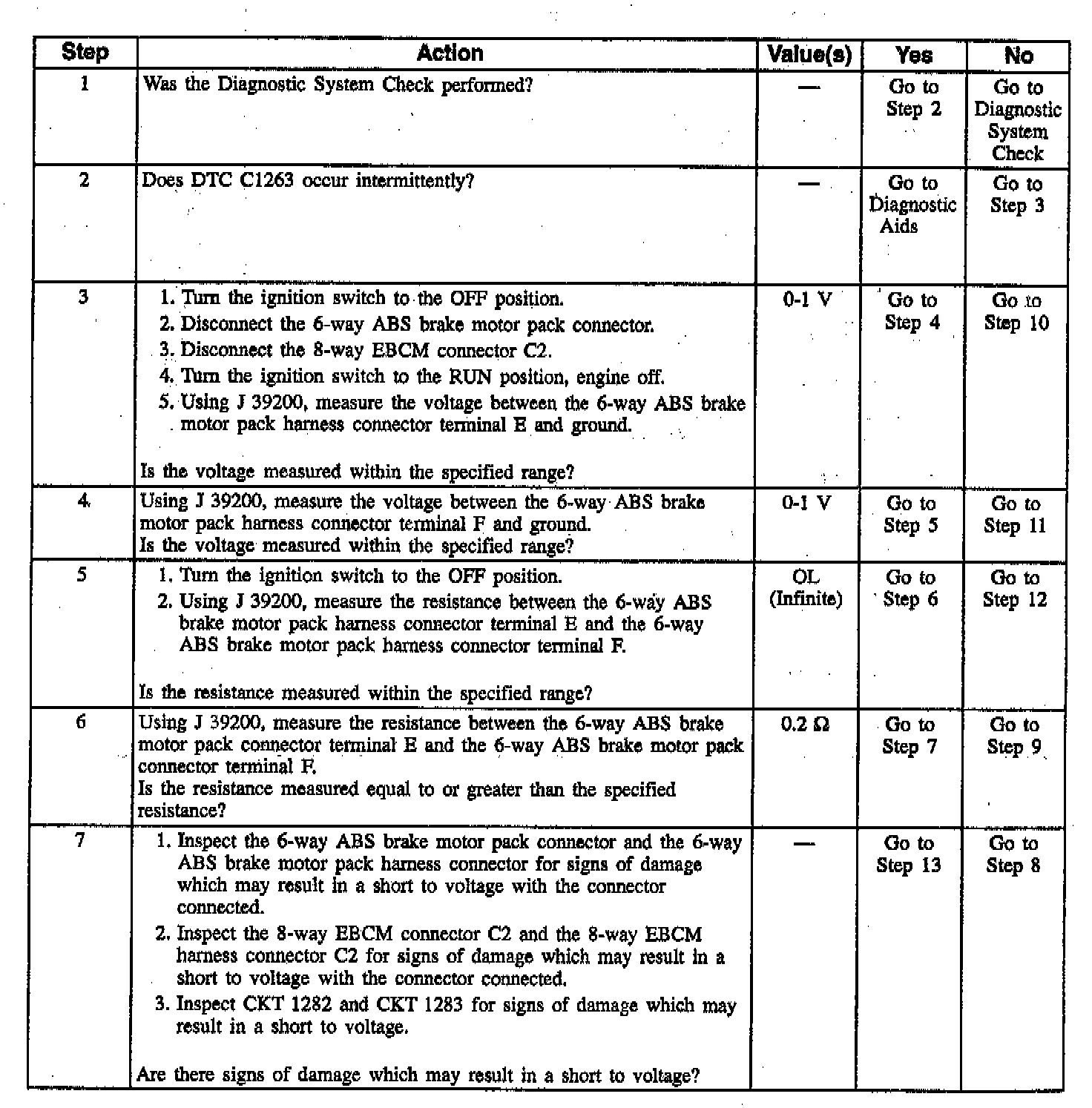 DTC C1263 can be set only when the ABS motor is commanded off. If the EBCM detects an out of range voltage on either of the right front ABS motor circuits indicating a circuit shorted to voltage or an ABS motor shorted, a malfunction exists.