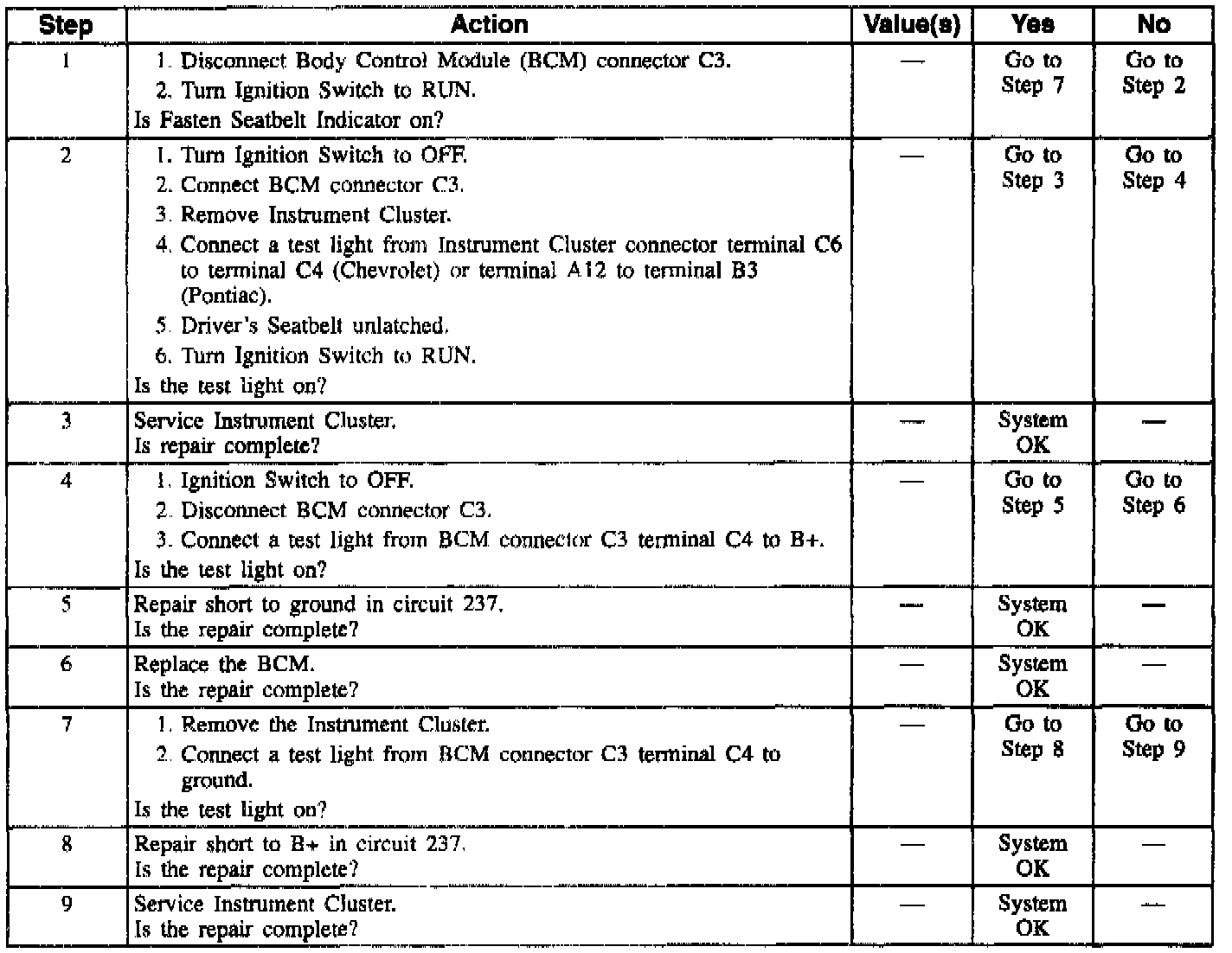 1. This step checks 'Fasten Seatbelt" indicator for operation with BCM disconnected, which would reveal a short to B+ in circuit 237.