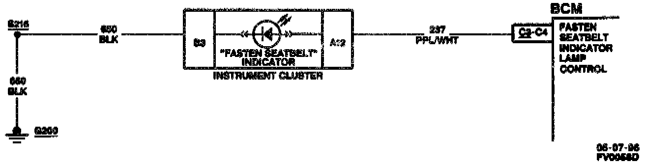 The BCM provides a 12 volt output to the "Fasten Seatbelt" Indicator Lamp on the Instrument Cluster while the driver's seatbelt is unfastened