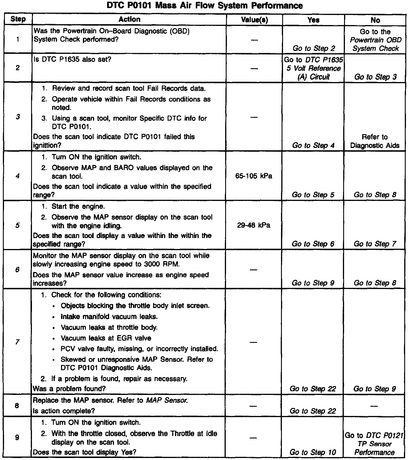 4. This step verifies a proper MAP/BARO value at initial key ON. If the MAP sensor is stuck the barometric pressure value will be incorrectly calculated. This will cause the predicted Mass Air Flow calculations to be inaccurate. DTC P0101 will set if the MAF sensor signal does not match the predicted MAF value.