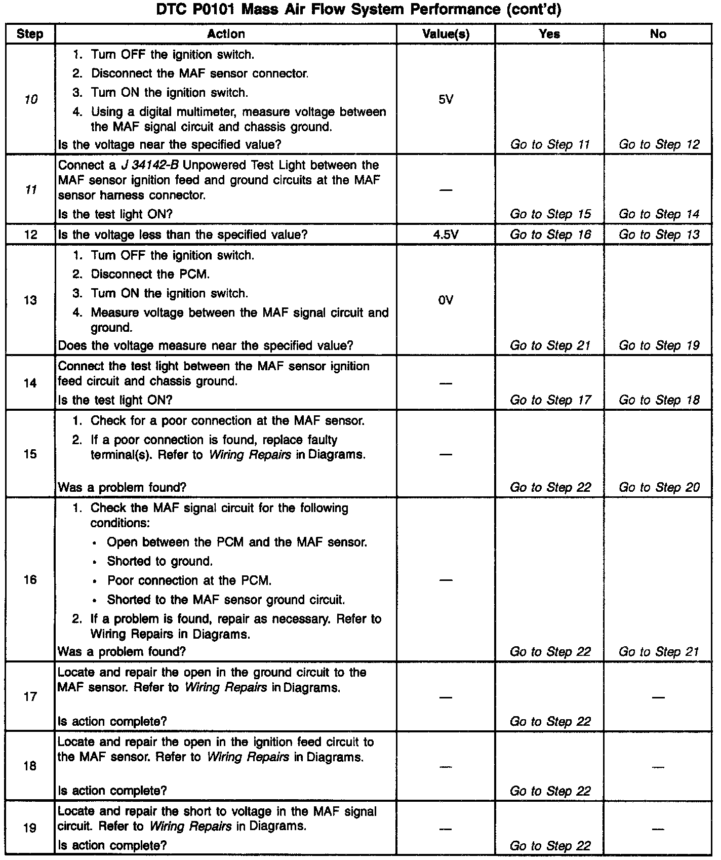 10. A voltage reading of less than 4 or over 6 volts at the MAF sensor signal circuit indicates a fault in the wiring or a poor connection.