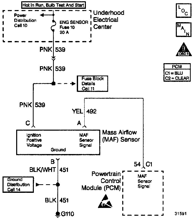 6. Verifies that ignition feed voltage and a good ground are available at the MAF sensor.