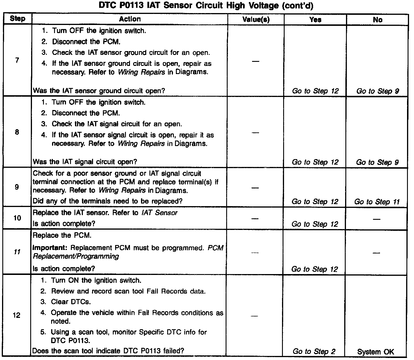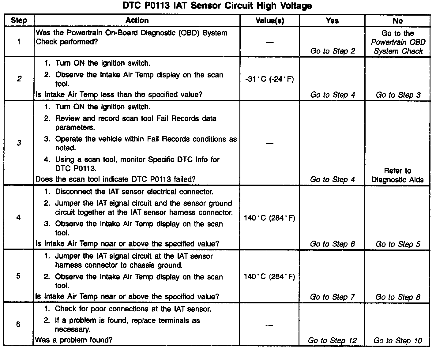 3. If DTC P0113 can be repeated only by duplicating the Fail Records conditions, refer to the Temperature Vs. Resistance Values Table. The table may be used to test the IAT sensor at various temperatures to evaluate the possibility of a shifted sensor that may be open above or below a certain temperature. If this is the case, replace the IAT sensor. If the IAT sensor appears to be OK, the fault is intermittent, refer to Diagnostic Aids.