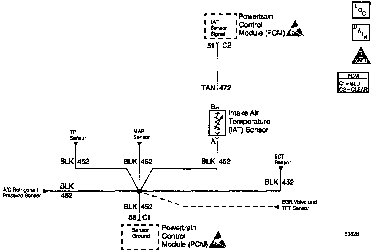 The Intake Air Temperature (IAT) sensor is a thermistor which measures the temperature of the air entering the engine. The PCM applies 5 volts through a pull-up resistor to the IAT sensor. When the intake air is cold, the sensor resistance is high and the PCM will monitor a high signal voltage on the IAT signal circuit. If the intake air is warm, the sensor resistance is lower causing the PCM to monitor a lower voltage. DTC P0113 will set when the PCM detects an excessively high signal voltage on the intake air temperature sensor signal circuit.