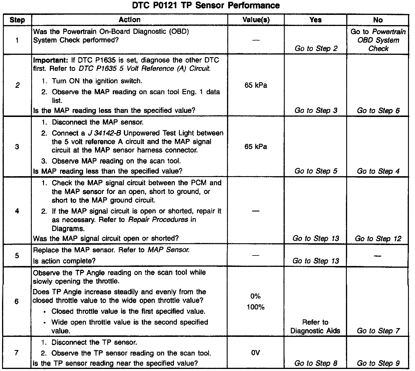 - Skewed MAP signal or faulty MAP sensor, An incorrect MAP signal may cause the PCM to incorrectly calculate the predicted TP sensor value during high engine load situations. Check for an unusually low MAP reading. This condition can cause DTC P0121 to be set.