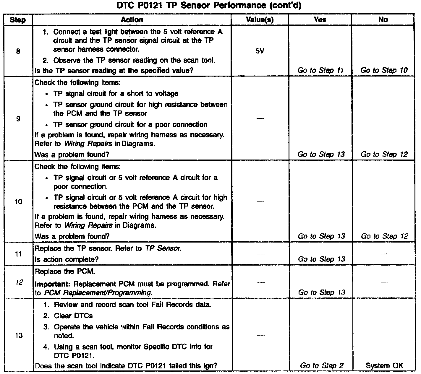 The Throttle Position (TP) sensor circuit provides a voltage signal that changes relative to throttle blade angle. The signal voltage will vary from less than 1 volt at closed throttle to about 4 volts at Wide Open Throttle (WOT). The TP signal is one of the most important inputs used by the PCM for fuel control and most of the PCM-controlled outputs. The PCM monitors throttle position and compares actual throttle position from the TP sensor to a predicted TP value calculated from engine speed. If the PCM detects an out of range condition, DTC P0121 will be set.