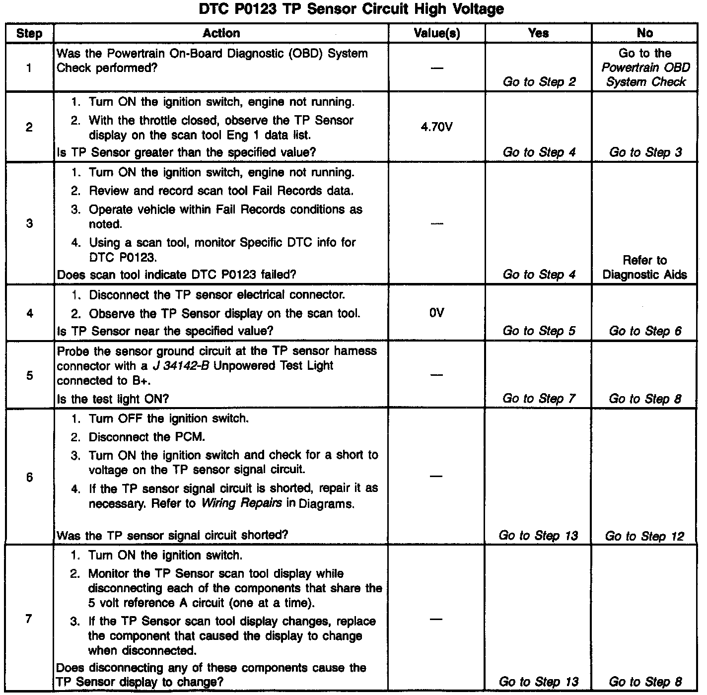- Faulty TP sensor: With the key ON, engine not running, observe the TP sensor display on the scan tool while slowly depressing the accelerator to wide open throttle. If a voltage over 4.71 volts is seen at any point in normal accelerator travel, replace the TP sensor.